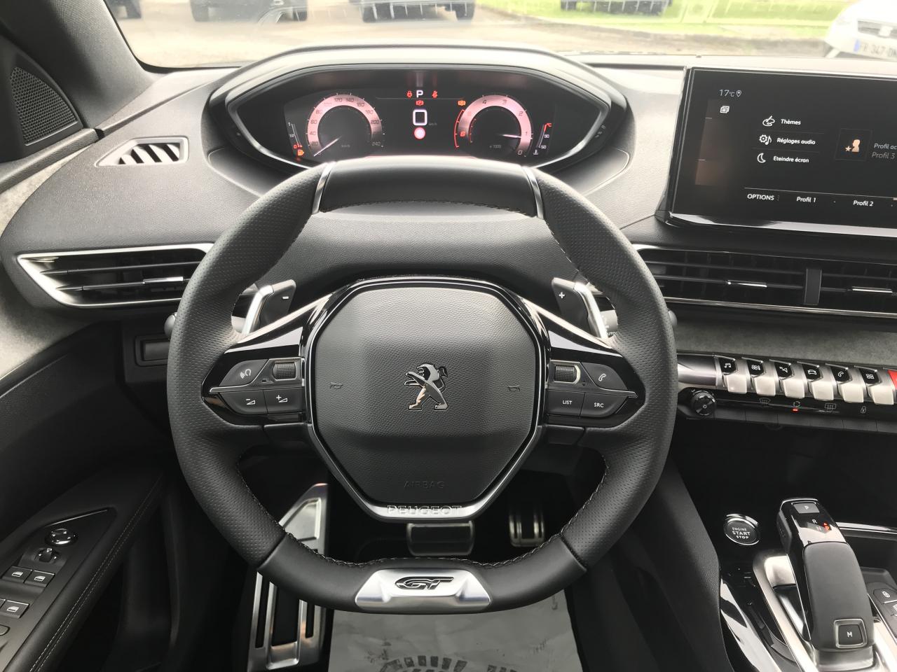 PEUGEOT Connect SOS & Assistance et TeleservicesPeugeot i-Cockpit avec combiné tête haute numérique, volant compact multi-fonctionsPlafonniers AV/AR à LED avec 2 spots de lecturePlancher de coffre 2 positionsPoches/filets aumonières au dos des sièges AVPrise 12 V (x3 : zone connectique, AR de console et coffre)Prises USB de charge (x2) au 2ème rangProjecteurs "Peugeot Full LED Technology" avec correction automatique de site, fonction Eclairage Virage Statique,"Foggy Mode" et feux diurnes à LED sous projecteursProtecteurs de bas de portes avec inserts Inox BrillantRétroviseur intérieur photosensible sans cadreRétroviseurs extérieurs dégivrants avec réglage et rabattement électriques, éclairage d'accueil à LED, témoin de surveillance d'angles mortsReconnaissance étendue des panneaux de signalisationSécurité enfants électrique des vitres ARSabot de pare-chocs AV peint MétallureSeuils de portes AV en InoxSiège conducteur avec réglage lombaireSiège passager AV avec mise en tabletteSièges AV réglables en hauteurSurtapis AV et ARSystème Start & StopToggle Switches chromés (touches piano d'activation des fonctions de l'écran tactile)Toit "Black Diamond"Toit "Black Diamond"Visiopark 1 : caméra de recul avec restitution sur l'écran tactile d'une vue AR et d'une vue de dessus de l'environnement AR du véhiculeVitres latérales AR et lunette AR chauffante surteintéesVolant cuir fleur perforé Mistral avec bagues chromées et badge GT6 airbags (Frontaux adaptatifs, latéraux AV, rideaux AV et AR)Accès et démarrage mains libresAccoudoir central AV à ouverture papillon, avec compartiment de rangement éclairé et réfrigérableAide graphique et sonore au stationnement ARAide graphique et sonore au stationnement AVAir conditionné automatique bi-zone avec aérateurs aux places ARAppuis-tête à sécurité optimisée réglables en hauteur (conducteur, passager et AR x3)Avertisseur de temps de conduiteBanquette AR rabattable 1/3 - 2/3 avec accoudoir central, trappe à skis et commandes de rabattement depuis le coffreBarres de toit longitudinales en aluminiumCalandre avec design évolutif chroméCanules d'echappement de style chroméesCommandes de lève-vitres avec inserts chromésCoques de rétroviseurs extérieurs Noir Perla NeraDécors de planche de bord et panneaux de portes Alcantara Gris GrevalDétection de sous-gonflage indirecteDirection assistée électrique, colonne de direction réglable en hauteur et profondeur (mécanique)Drive Mode : Choix de 2 modes de conduite (Eco ou Sport)Driver Sport PackEnjoliveur d'arc de pavillon en Inox BrillantEnjoliveurs d'ailes AV chromésEssuie-vitre AV avec système de lavage "Magic Wash"Fixations ISOFIX (passager AV et aux places latérales AR)Fonction "Mirror Screen" (Apple CarPlay / Android Auto )Frein de stationnement électrique avec aide au démarrage en pente et serrage automatiqueGarnissage Tissu BELOMKA / TEPHabitacle et ciel de pavillon Noir MistralIndicateur de rapport conseilléJantes alliage 18" diamantées DETROIT bi-ton Noir Onyx brillant avec pneumatiques 225/55 R18 102 VKit de dépannage de pneumatique : compresseur 12 volts, flacon de produit de colmatage, anneau de remorquage, deux cales de roue, manivelle de frein de stationnement électriqueLécheurs de vitres, joncs de vitres latérales en Inox BrillantLève-vitres AV et AR électriques séquentiels avec antipincementNavigation 3D connectée avec écran tactile capacitif 10" HD Avec reconnaissance vocale, cartographie Europe, services de Navigation connectée TomTom 3 ans inclus, connexion automatique et permanente via carte SIM intégrée au véhiculePédalier et repose-pied conducteur en aluminiumPack City 1Pack Drive Assist PlusPack Eclairage d'ambiancePack VisibilitéPares-soleil avec miroirs de courtoisie éclairésPassages de roues rapportés Noir Mat